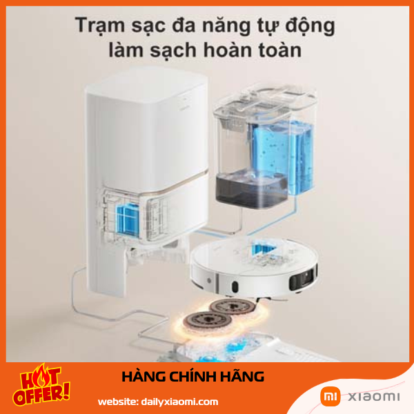 Trạm vệ sinh 7-trong-1: giặt nước nóng 65°C, sấy khí nóng, tự đổ rác 75 ngày, tự thêm nước + dung dịch 10
