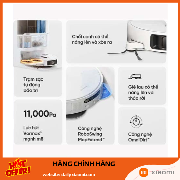 • Hệ thống quạt hút thế hệ mới Vormax™: Tạo lực hút 11.000 Pa mạnh mẽ, kết hợp cảm biến bụi tự động tăng công suất khi cần, đảm bảo hút sạch 99% bụi mịn và lông thú cưng mà không làm ồn ào (chỉ 59-80 dB).