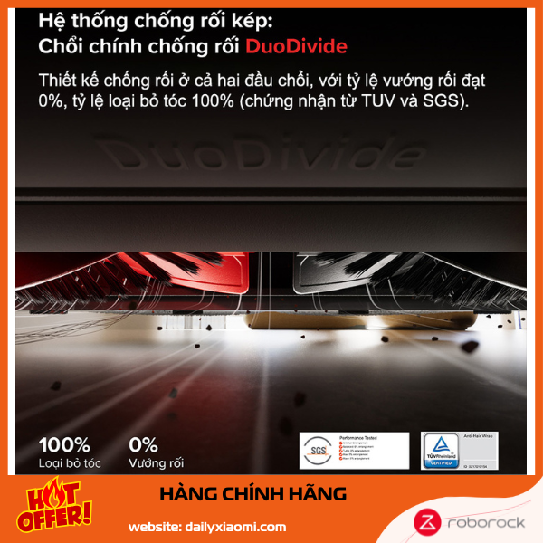 - 18.000 Pa hút sạch khu vực mép nơi bụi thường tích tụ nhiều nhất, con lăn chống rối gom lông thú hiệu quả.