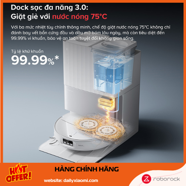 - Khăn được giặt nước nóng 60°C thường xuyên → lau mép không bị lem lại bẩn, khác biệt hoàn toàn so với robot lau nhà không trạm giặt.