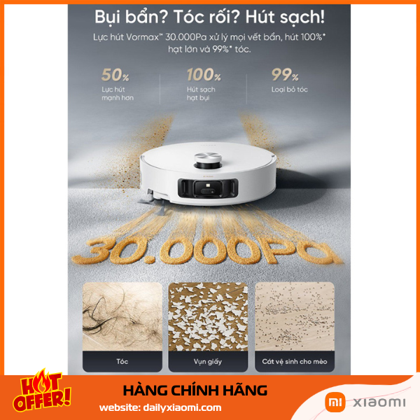 - Robot hút bụi Xiaomi Mijia M30 Pro: Lực hút 7.000Pa, pin 210 phút, camera AI nhận diện 55 vật thể, lau xoay 360°, dock gom bụi 75 ngày. Giá khoảng 12.000.000 VND. Dành cho không gian hẹp với thiết kế mỏng.