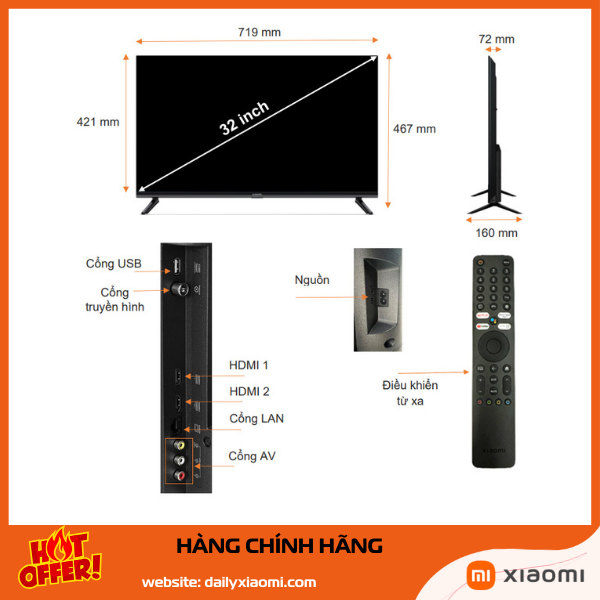 Tivi xiaomi 32 inch có kích thước tổng thể khoảng 715-720mm chiều rộng, 180-190mm chiều sâu (có chân đế), chiều cao khoảng 465-470mm. Trọng lượng chỉ 3.5-4kg (không chân đế), rất nhẹ và dễ di chuyển.