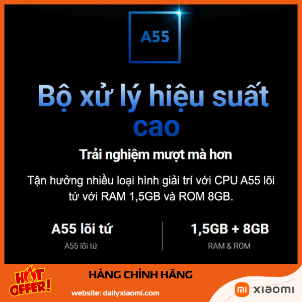 Chip xử lý Quad-core Cortex-A55/A53, GPU Mali-G31/G52, RAM 1-1.5GB, bộ nhớ trong 8GB (còn trống ~4GB). Hiệu năng đủ cho tác vụ cơ bản: mở app nhanh (YouTube <5 giây), chuyển kênh mượt.