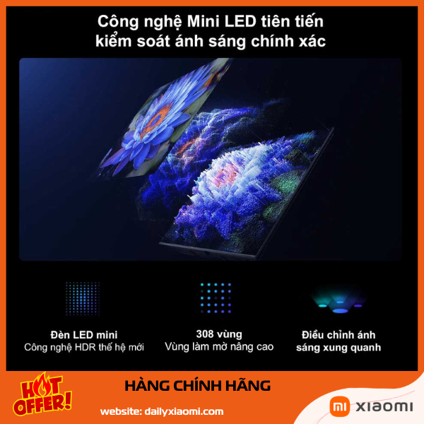 Đây là "linh hồn" của sản phẩm: 308 vùng local dimming độc lập, cho phép kiểm soát chính xác độ sáng từng vùng. Độ sáng đỉnh 1200 nits giúp hình ảnh nổi bật trong phòng sáng mạnh (cửa sổ lớn, đèn nhiều). Tỷ lệ tương phản động cực cao, màu đen sâu gần mức OLED mà không bị burn-in.