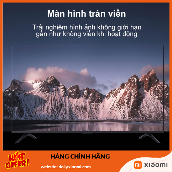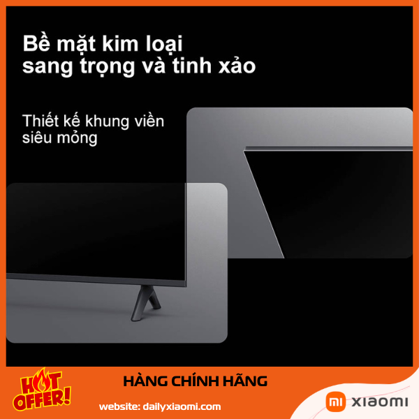 Tivi Xiaomi A 55 inch quốc tế sở hữu thiết kế hiện đại với viền siêu mỏng (bezel-less), khung kim loại nguyên khối cao cấp, tạo cảm giác sang trọng dù thuộc phân khúc giá tốt. Thân máy mỏng chỉ khoảng 8.2 cm (không tính chân đế), trọng lượng khoảng 8.1 kg – dễ dàng treo tường hoặc đặt bàn.