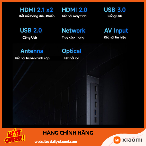 Tivi Xiaomi S85 Mini LED nội địa trang bị đầy đủ cổng: 3-4 HDMI 2.1 (hỗ trợ 4K@120Hz), 2 USB, LAN, WiFi 6, Bluetooth 5.0. Điều này cho phép kết nối dễ dàng với soundbar, tay cầm game, loa ngoài hoặc máy tính.